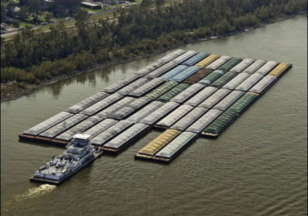 This photo shows a ‘boat’ pushing a ‘tow’ of ‘barges’. These are covered barges, maybe carrying grain or other cargo being protected from the weather. This might be a typical “load” found on the Lower Mississippi River between New Orleans and Cairo, Illinois where the water is nice and wide. On the more narrow upper rivers the tows are not able to be as wide.